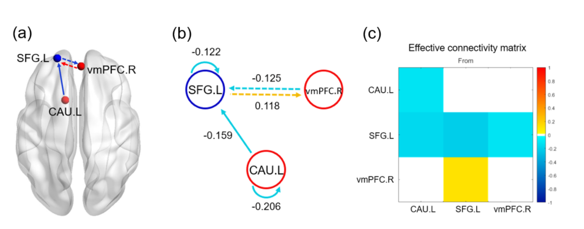 图2 有效连接的组间差异。(a)超重肥胖组的有效连接;(b)组间差异总结图;(c)有效连接矩阵的组间差异。