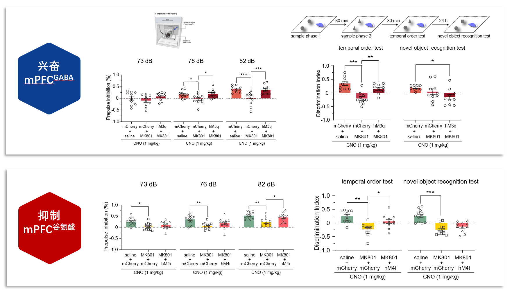 本论文研究发现,采用化学遗传学技术激活小鼠内侧前额叶谷氨酸能神经元或抑制GABA能神经元(即内侧前额叶“兴奋/抑制”比率异常升高)导致感觉门控缺失,时序记忆与24小时新物体识别记忆缺陷,并且能诱发小鼠产生精神分裂症样高自发活动,说明内侧前额叶“兴奋/抑制”失衡将诱导动物产生精神分裂症样表型。