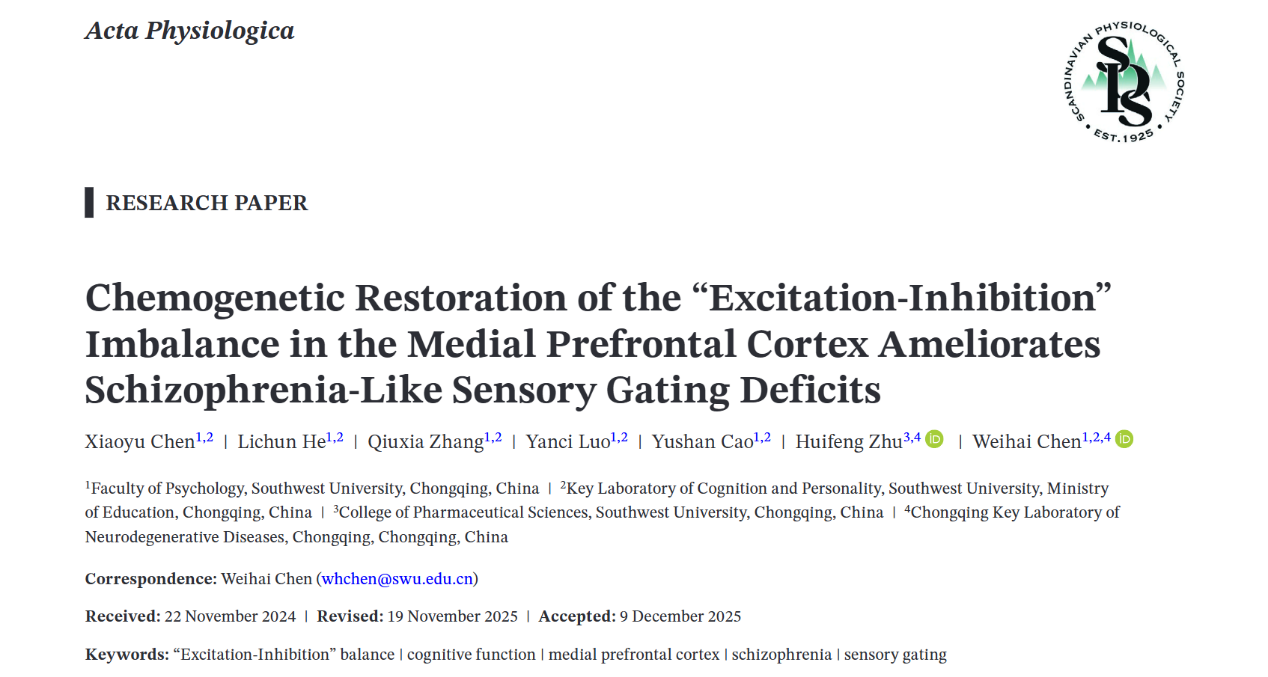 Xiaoyu Chen, Lichun He, Qiuxia Zhang, Yanci Luo, Yushan Cao, Huifeng Zhu, Weihai Chen*. Chemogenetic restoration of the “Excitation-Inhibition” imbalance in the medial prefrontal cortex ameliorates schizophrenia-like sensory gating deficits. Acta Physiologica. 242 (2), 2026: e70151.