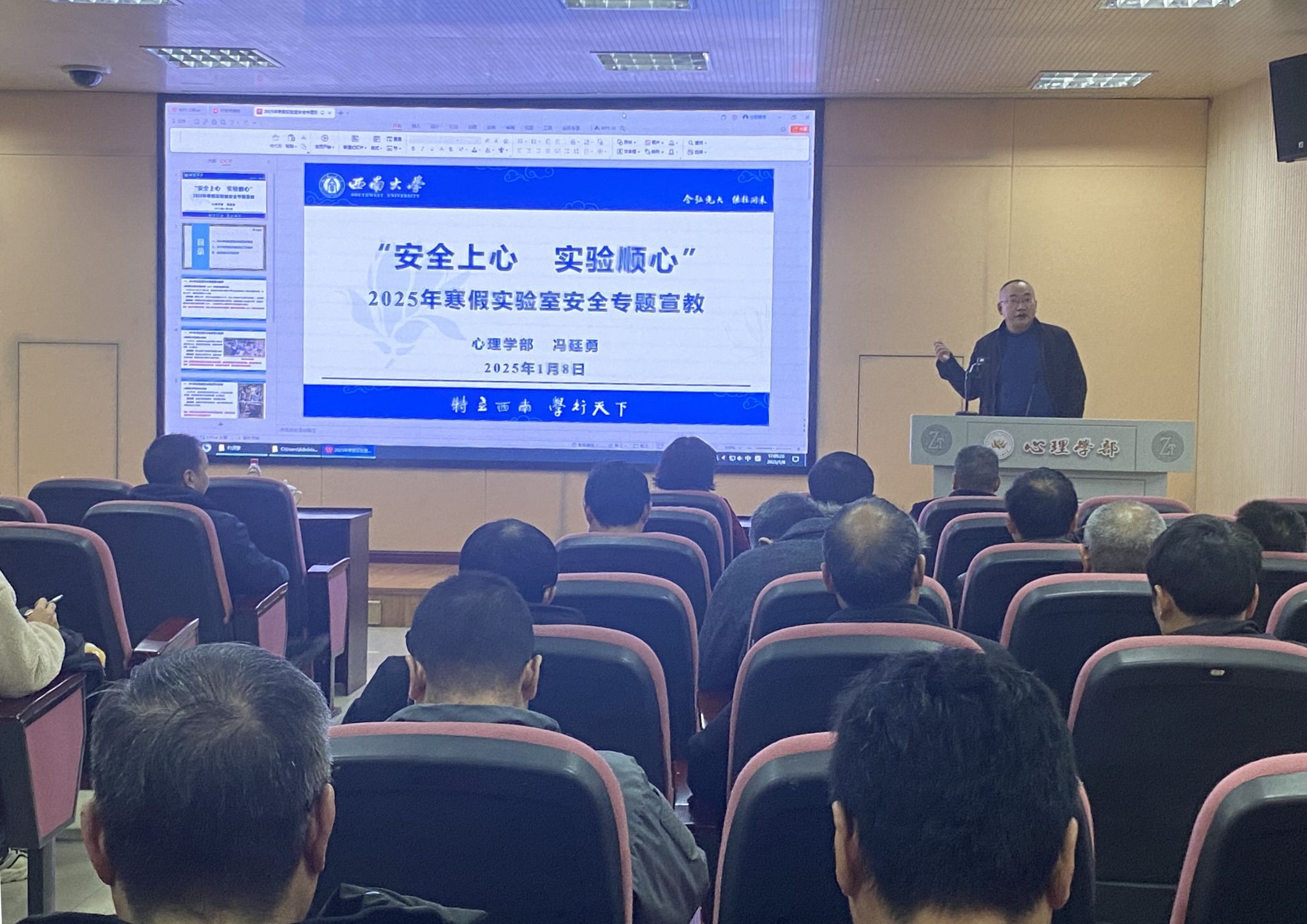 为贯彻落实《西南大学2024年秋季学期期末实验室安全隐患整治暨寒假实验室安全工作任务书》精神,2025年1月8日下午,学部副部长冯廷勇对全体教职员工开展了寒假实验室安全专题宣教,并在会后进行了实验室安全检查。